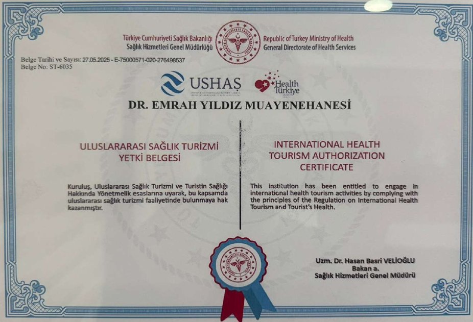 Tesisimiz, Uluslararası Sağlık Turizmi ve Turistin Sağlığı Hakkında Yönetmelik kapsamında, Uluslararası Sağlık Turizmi Sağlık Tesisi Yetkinlik Kriterleri’ne ve Yönetmeliğin genel esaslarına uyarak, Uluslararası Sağlık Turizmi faaliyetinde bulunmaya hak kazanmıştır.